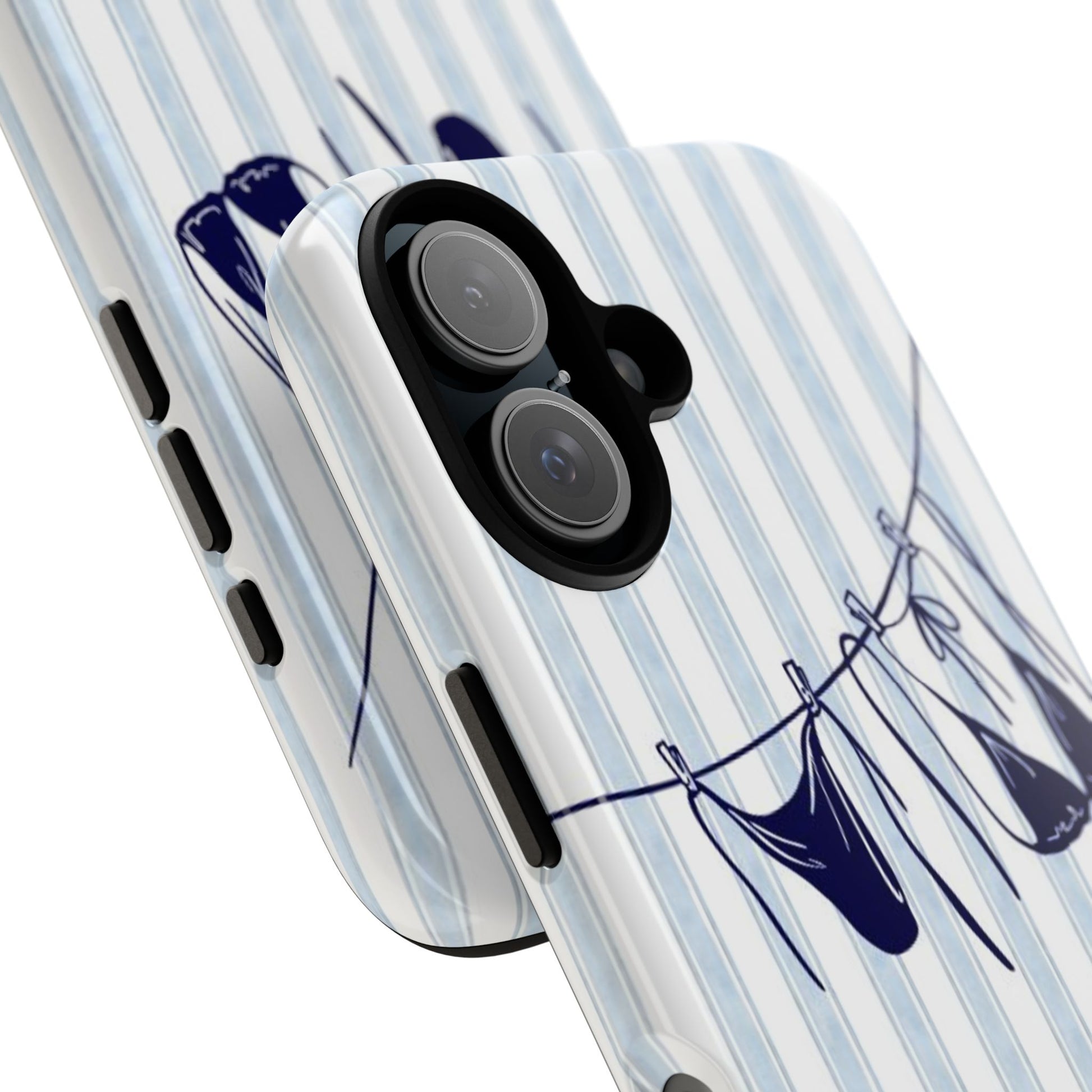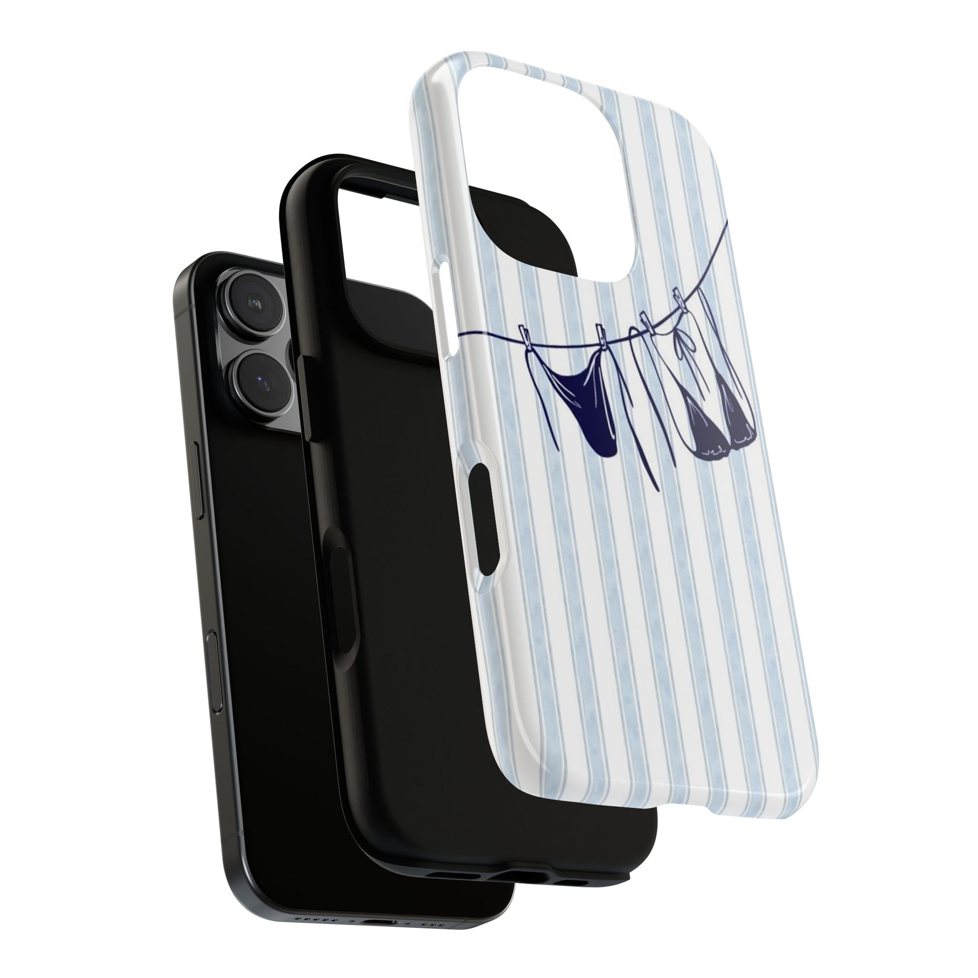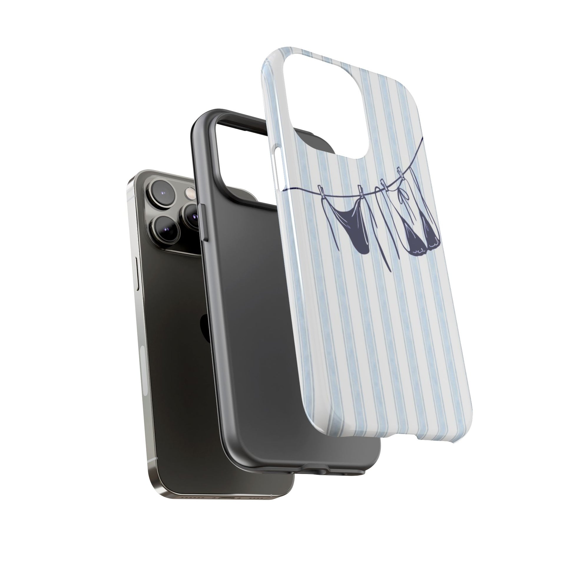 Introducing a stylish and protective phone case that combines durability with artful design. This phone case is perfect for anyone looking to express their personality while ensuring their device stays safe. The beautiful hand-drawn design of hanging swimsuits on a soft striped background evokes a carefree summer vibe, bringing warmth and charm to your daily routine.
