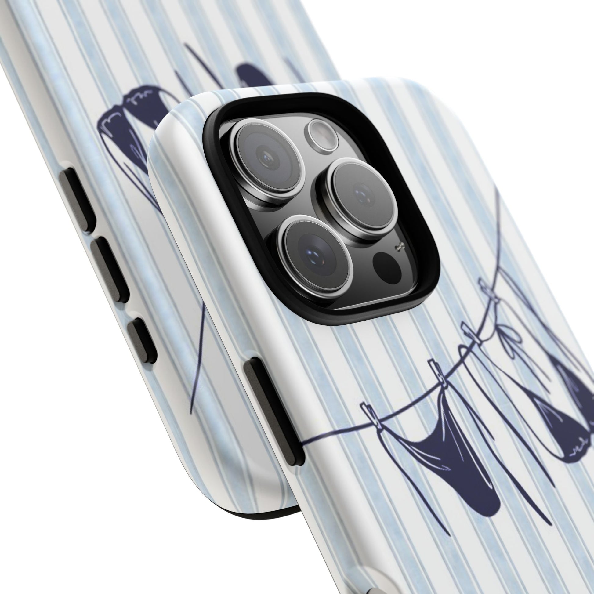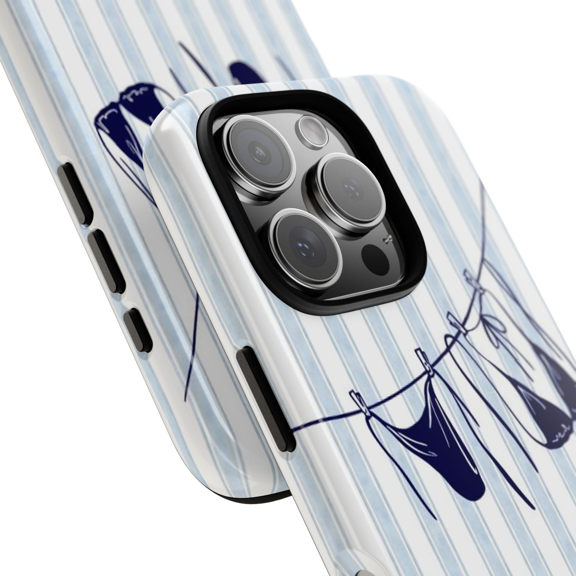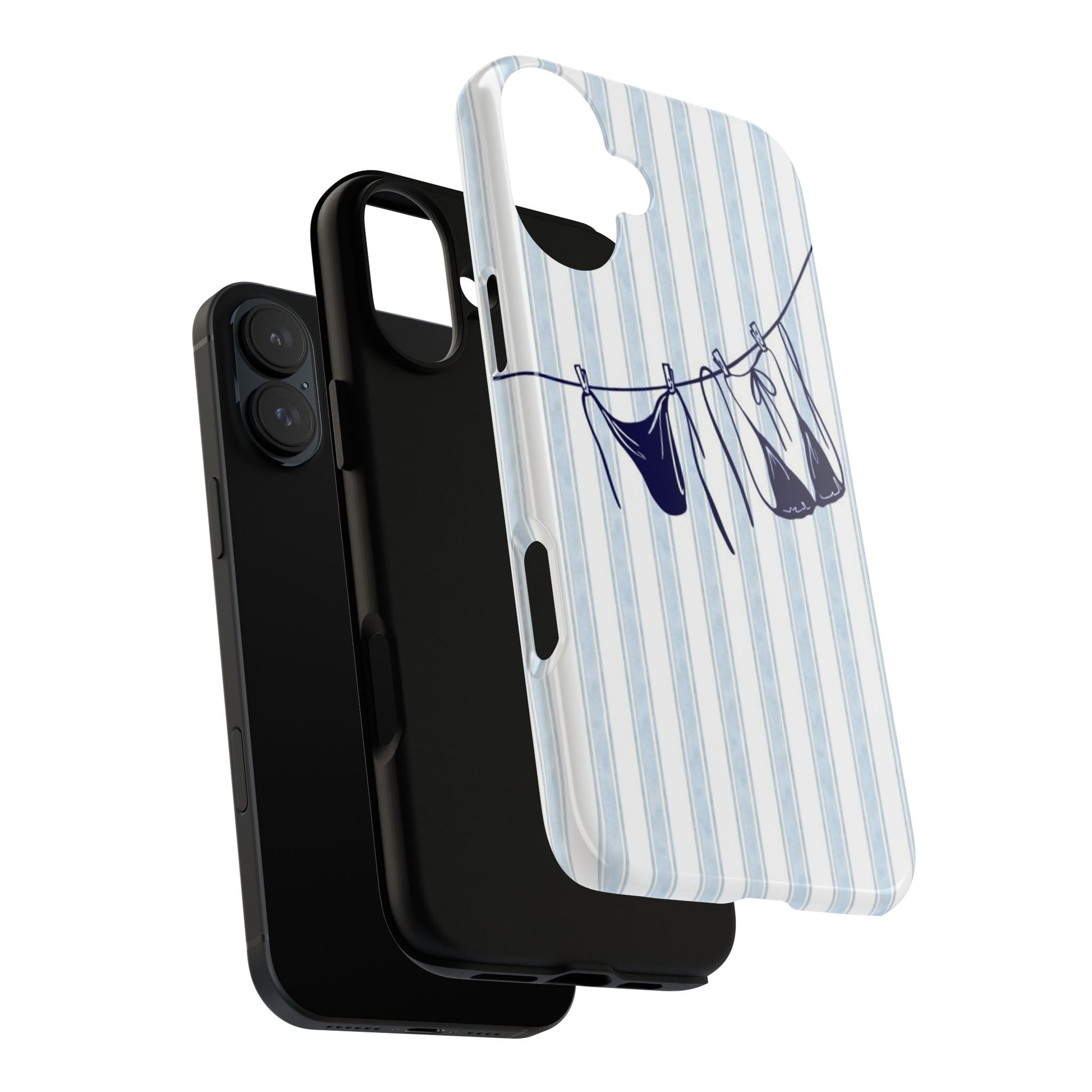 Introducing a stylish and protective phone case that combines durability with artful design. This phone case is perfect for anyone looking to express their personality while ensuring their device stays safe. The beautiful hand-drawn design of hanging swimsuits on a soft striped background evokes a carefree summer vibe, bringing warmth and charm to your daily routine.